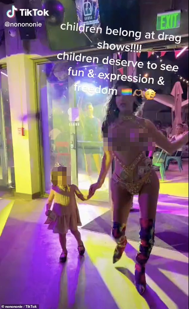 The video featuring the bare-chested transgender performer and child was shared on TikTok by a user named “nononie” who gleamed over the lewd performance.