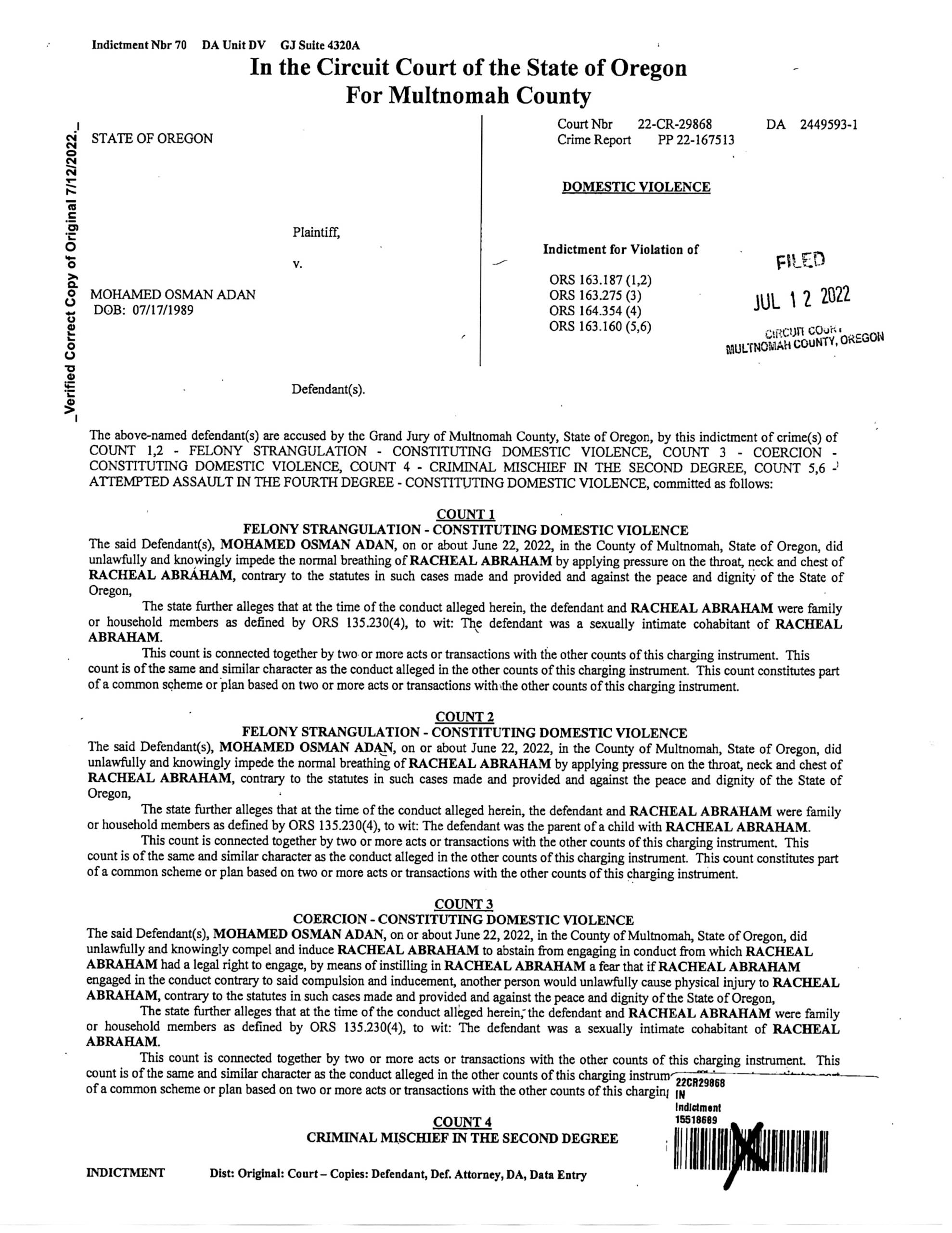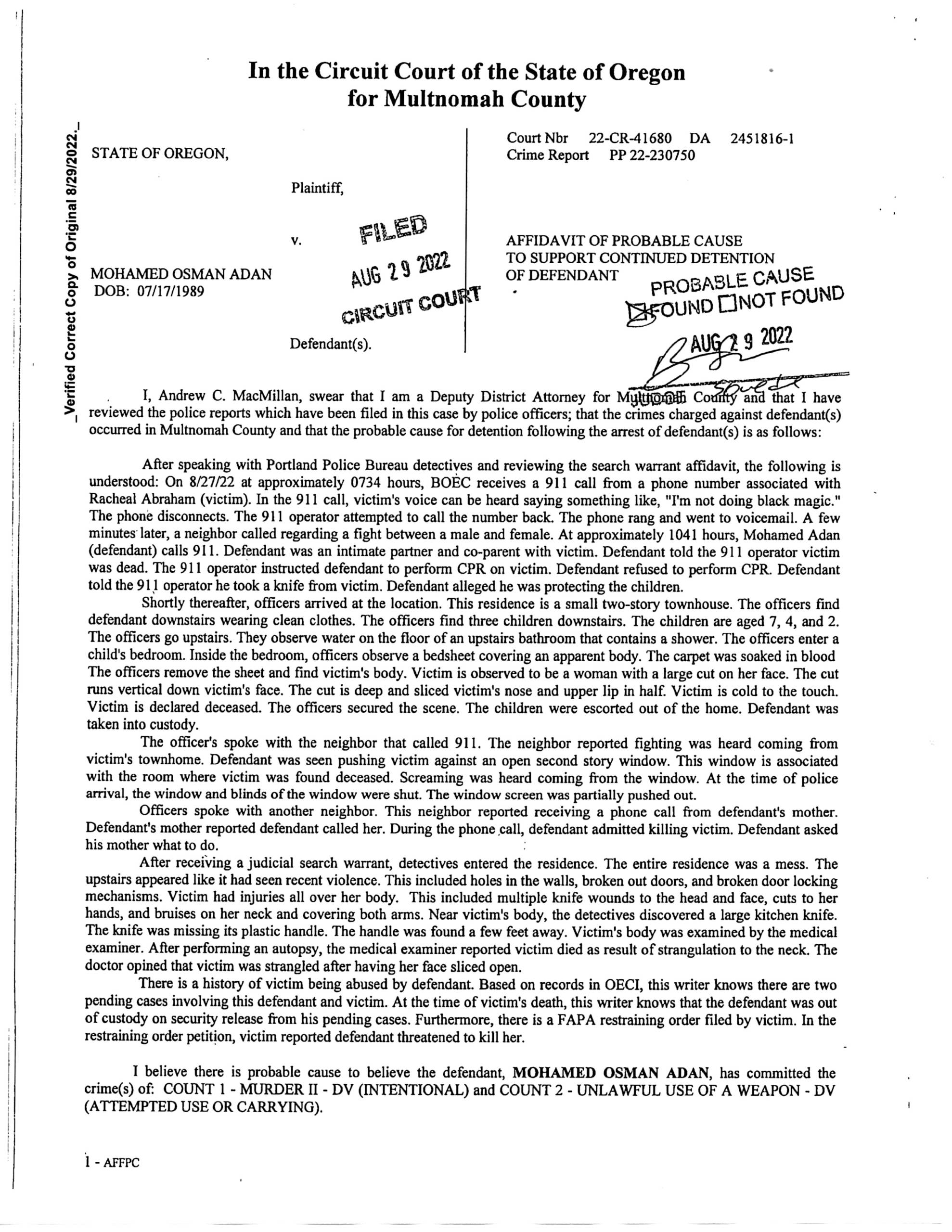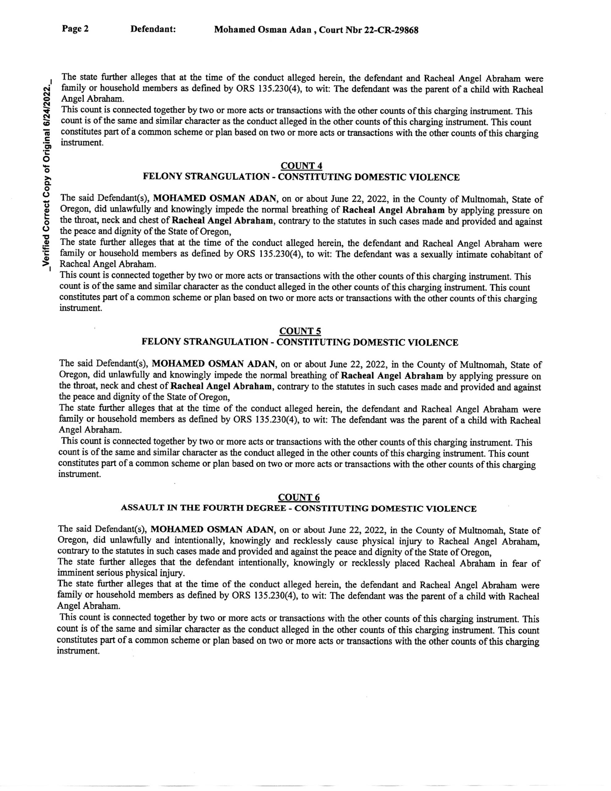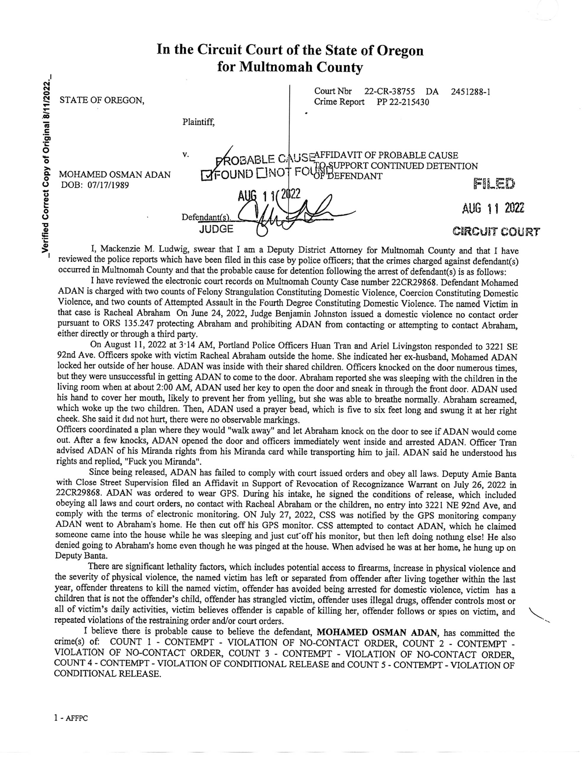 On August 11, 2022 at 3:14 AM, Portland Police Officers Huan Tran and Ariel Livingston responded to 3221 SE 92nd Ave. Officers spoke with victim Racheal Abraham outside the home. She indicated her ex-husband, Mohamed ADAN locked her outside of her house. ADAN was inside with their shared children. Officers knocked on the door numerous times, but they were unsuccessful in getting ADAN to come to the door. Abraham reported she was sleeping with the children in the living room when at about 2:00 AM, ADAN used her key to open the door and sneak in through the front door. ADAN used his hand to cover her mouth, likely to prevent her from yelling, but she was able to breathe normally. Abraham screamed, which woke up the two children. Then, ADAN used a prayer bead, which is five to six feet long and swung it at her right
