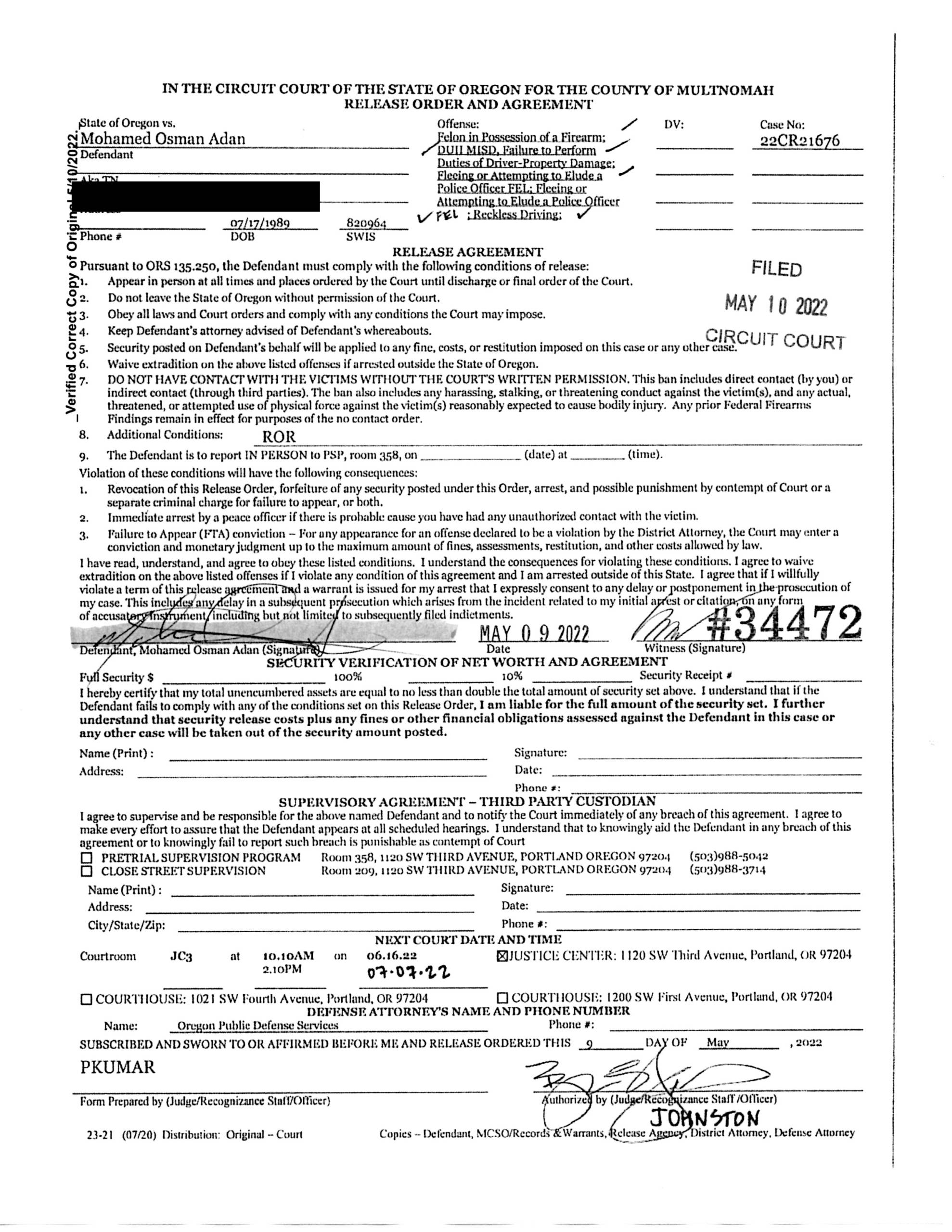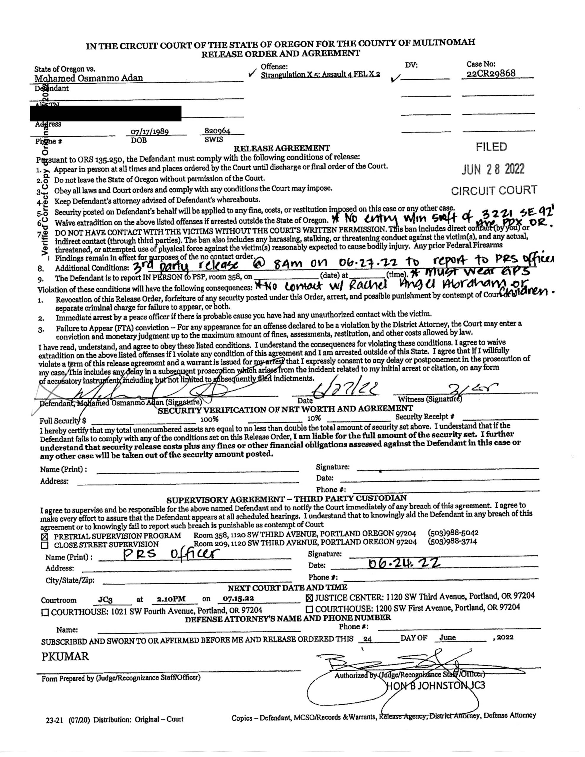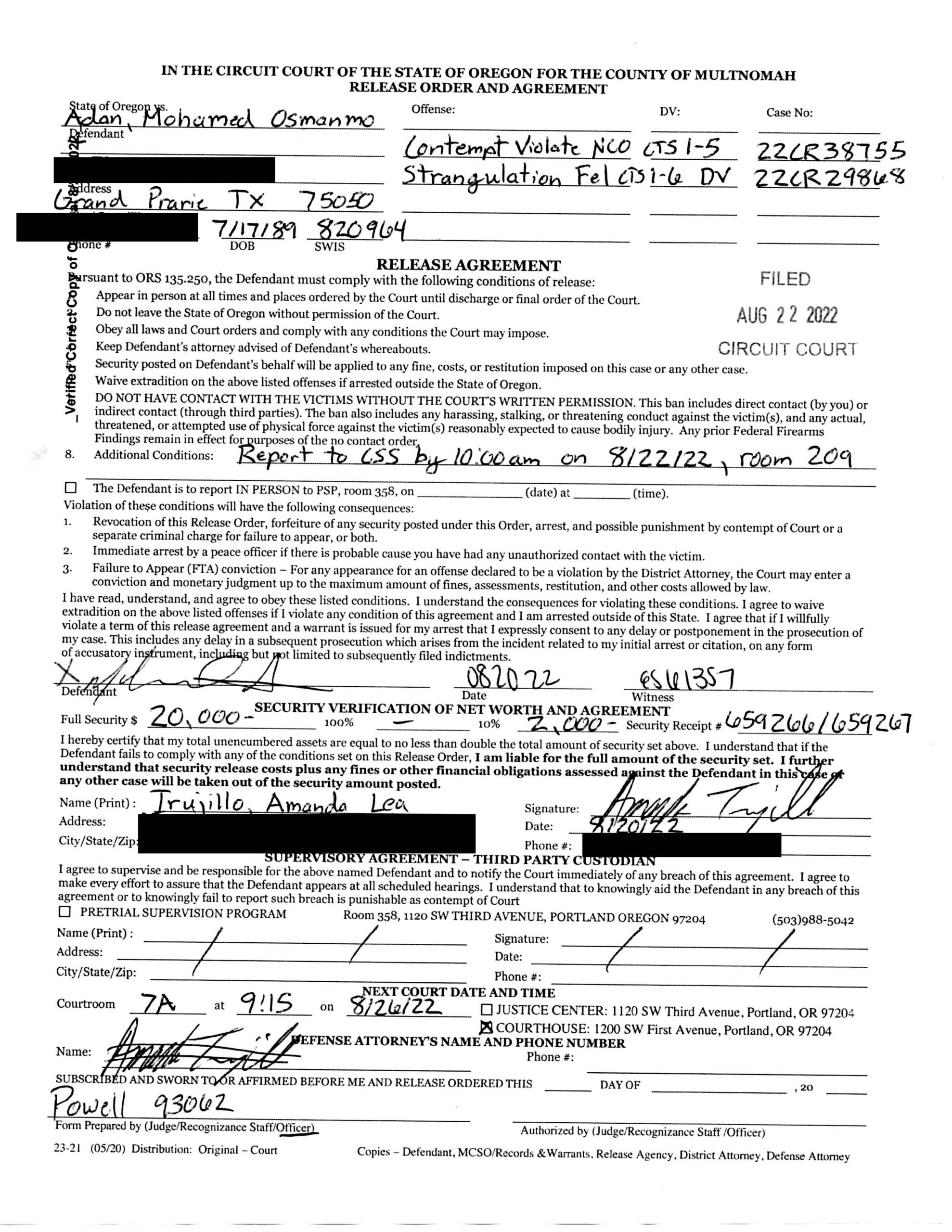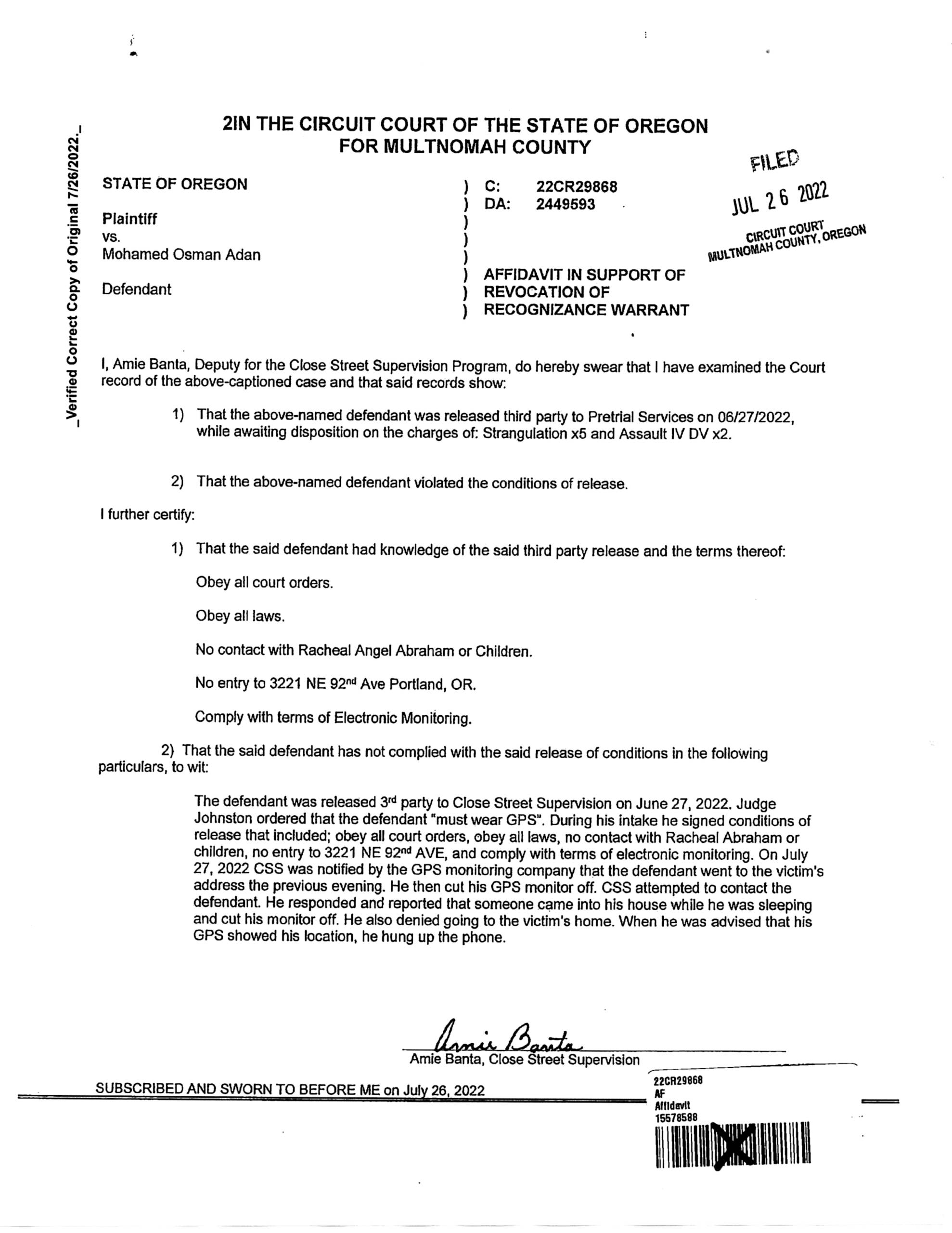 Since being released, ADAN has failed to comply with court issued orders and obey all laws. Deputy Amie Banta with Close Street Supervision filed an Affidavit in Support of Revocation of Recognizance Warrant on July 26, 2022 in 22C29868. ADAN was ordered to wear GPS. During his intake, he signed the conditions of release, which included obeying all laws and court orders, no contact with Racheal Abraham or the children, no entry into 3221 NE 92nd Ave, and comply with the terms of electronic monitoring. ON July 27, 2022, CSS was notified by the GPS monitoring company ADAN went to Abraham’s home. He then cut off his GPS monitor. CSS attempted to contact ADAN, which he claimed someone came into the house while he was sleeping and just cut off his monitor, but then left doing nothing else! He also denied going to Abraham’s home even though he was pinged at the house. When advised he was at her home, he hung up on Deputy Banta.