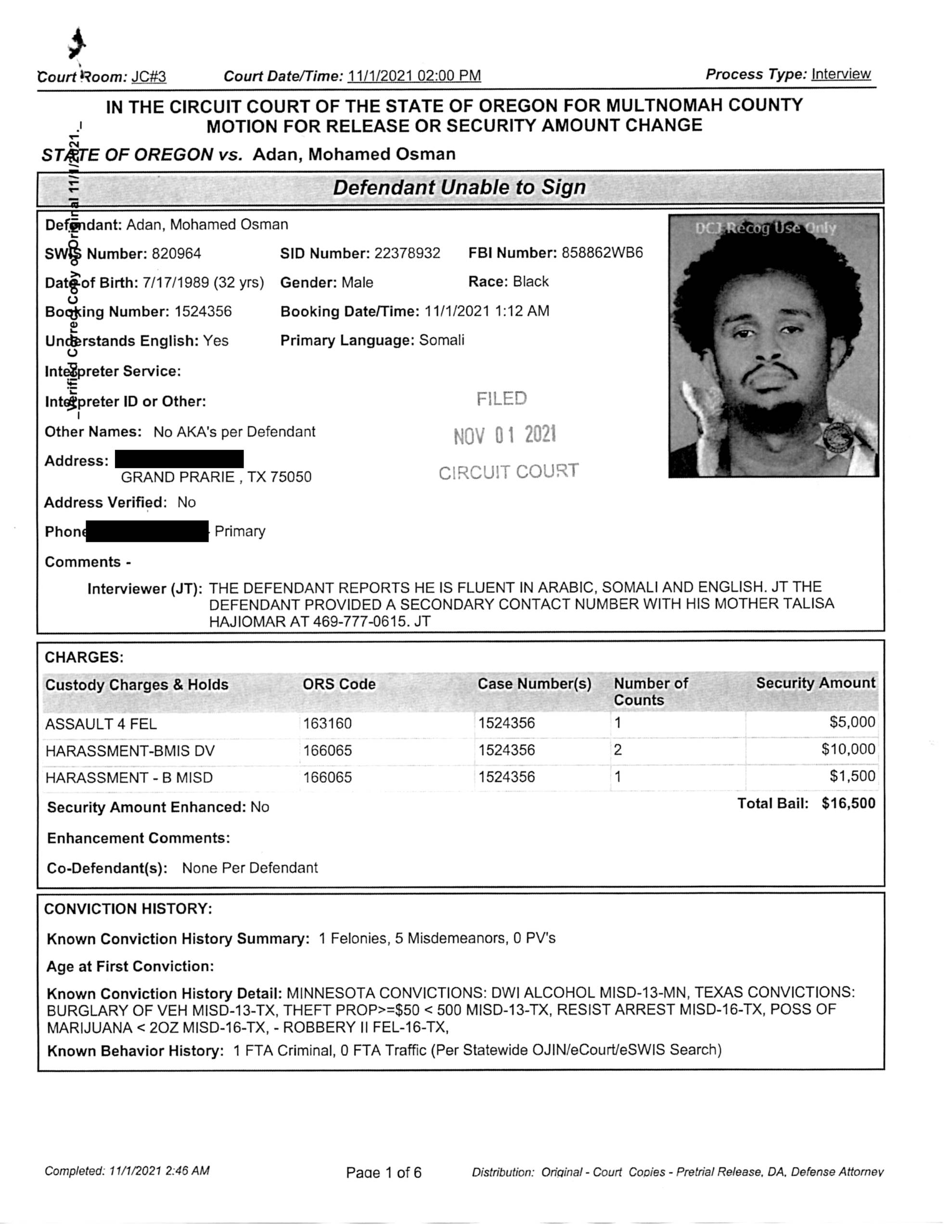 – In November of 2021 Adan was facing charges of Fourth Degree Assault and three counts of Harassment. Those charges were dismissed by the Multnomah County DA’s office.