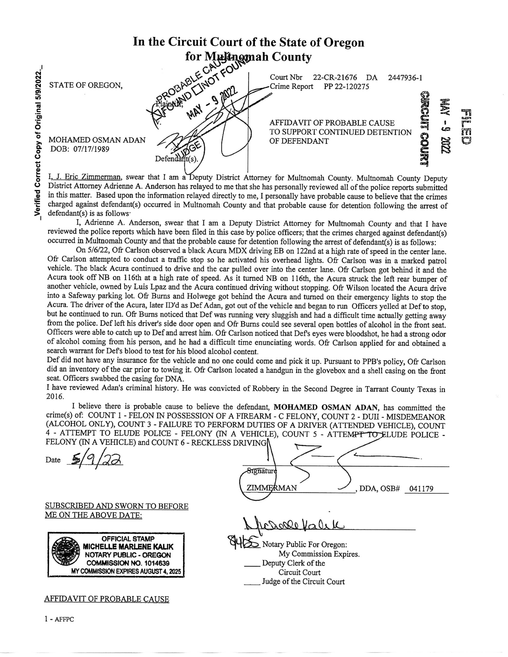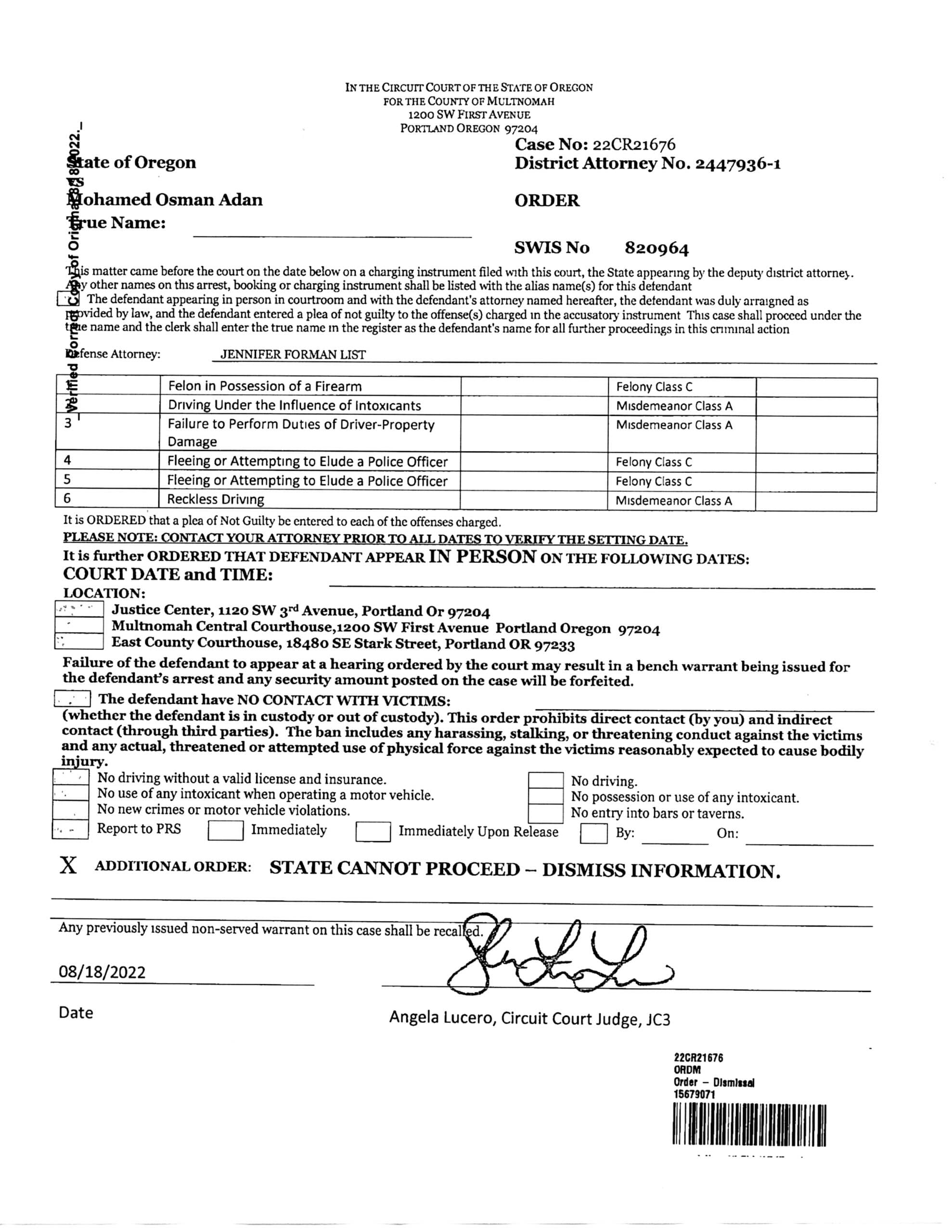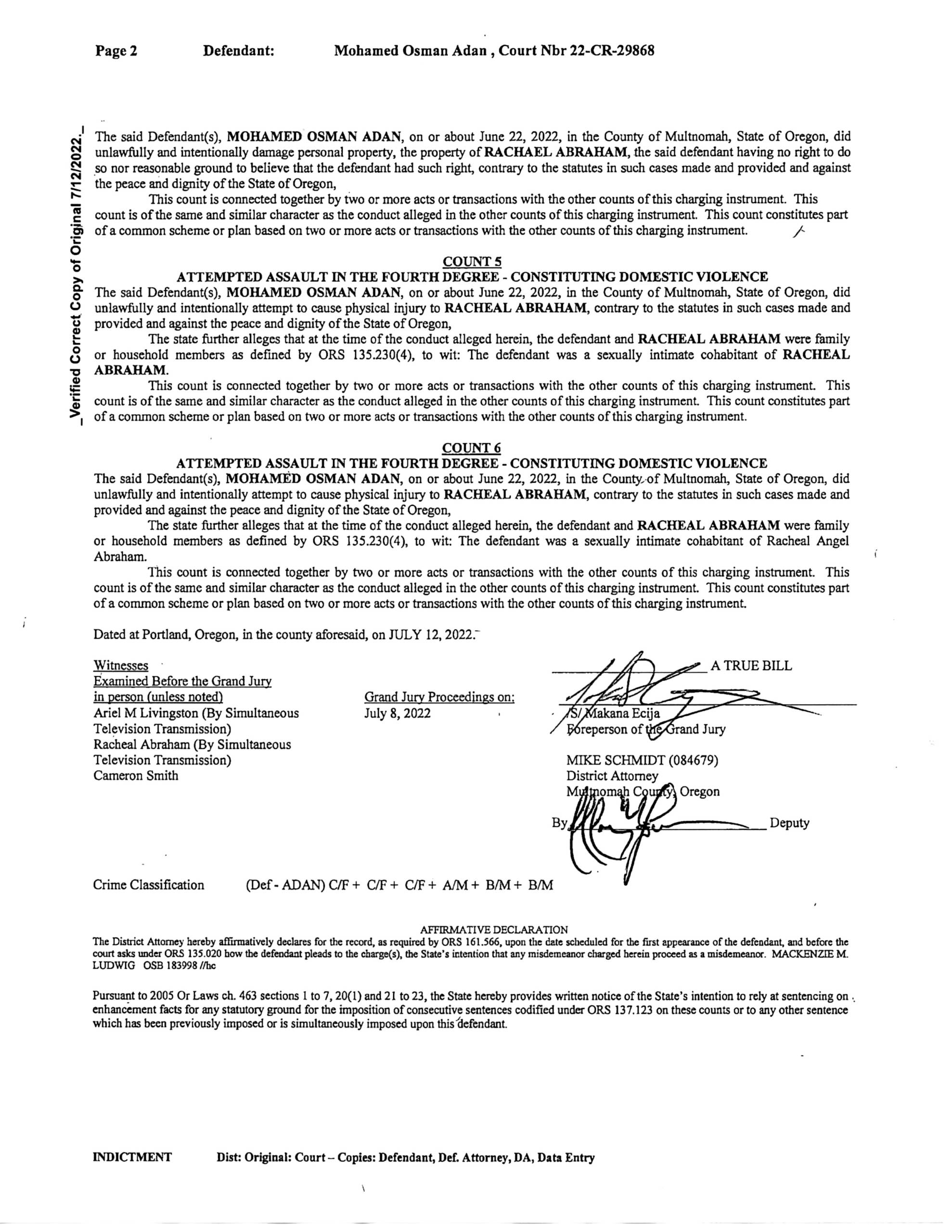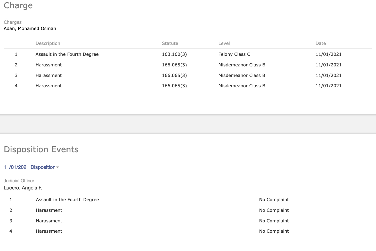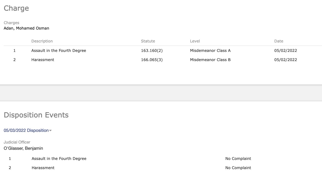 – In May of 2022 Adan was facing another accusation of Fourth Degree Assault and only one count of Harassment this time. Those charges were dismissed by the Multnomah County DA’s office.