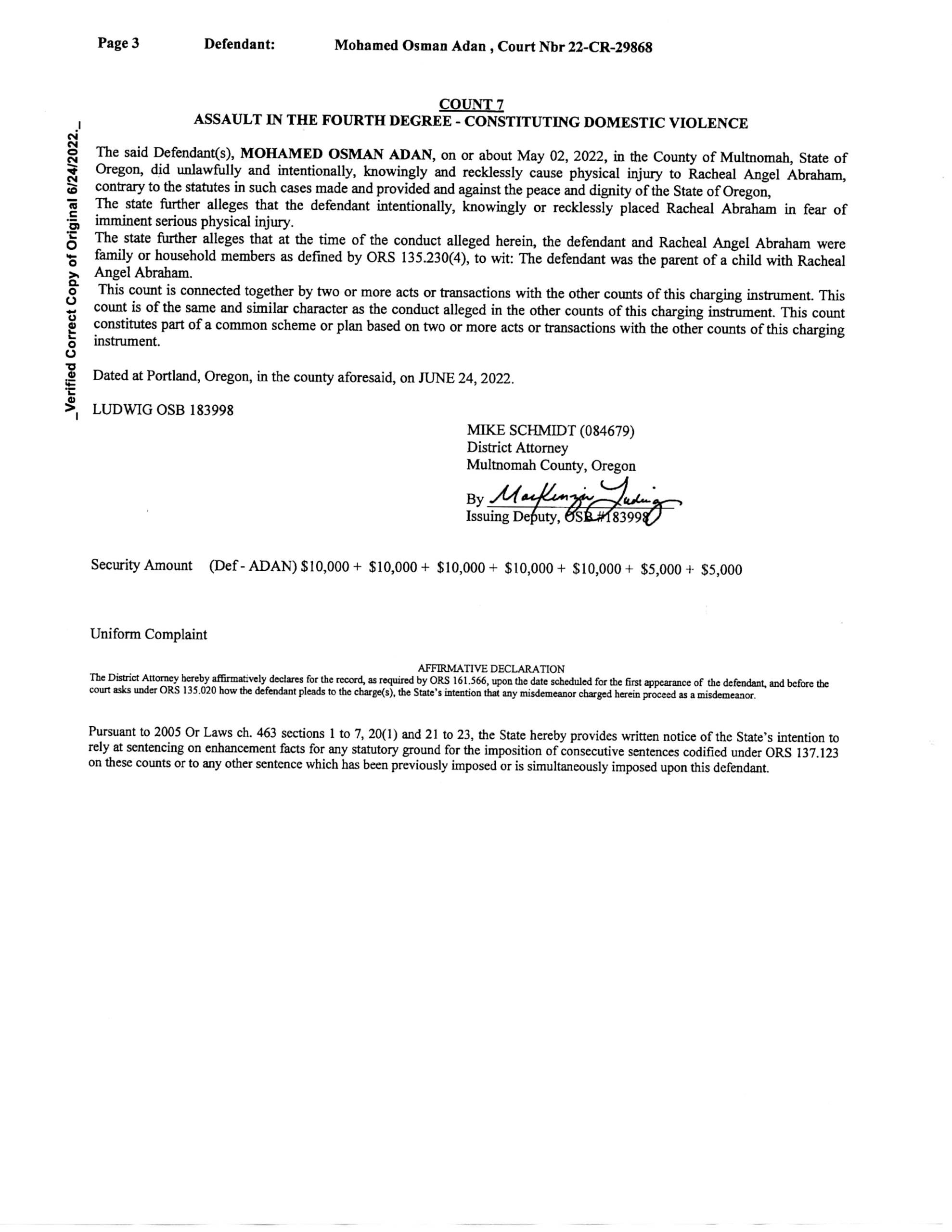 – In June of 2022 Adan was arrested on charges of five counts of Felony Strangulation and two counts of Assault in the Fourth Degree (click on images to enlarge). The listed victim is Rachael Angel Abraham.